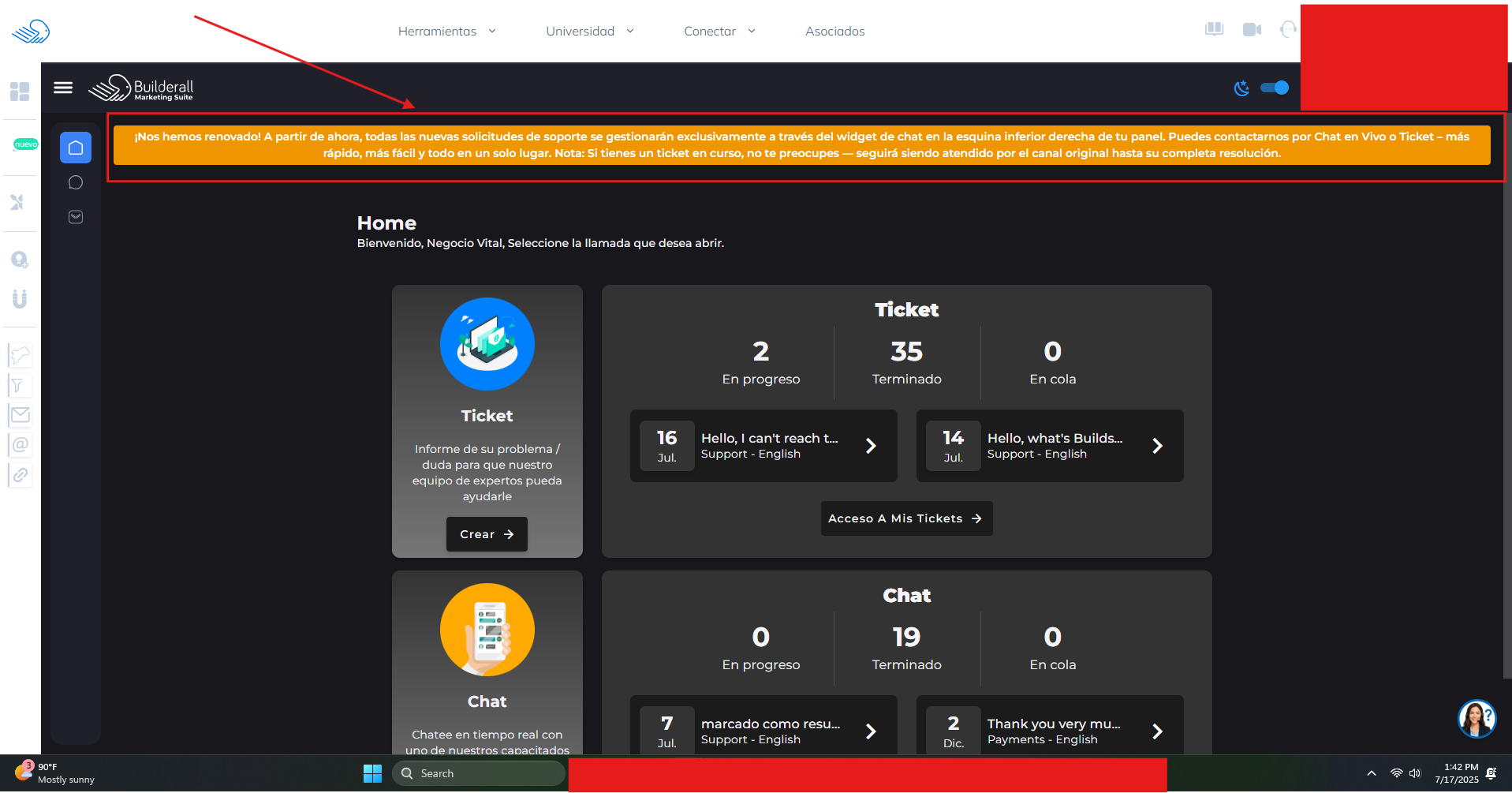 Toda la atención al cliente se está trasladando a un widget de chat en el panel de usuario del lado derecho. Se acabaron los tickets tradicionales y la asistencia por correo electrónico para nuevas consultas. Los tickets existentes se gestionarán, por ahora, pero para obtener ayuda en el futuro será necesario usar el chat en vivo de la aplicación.