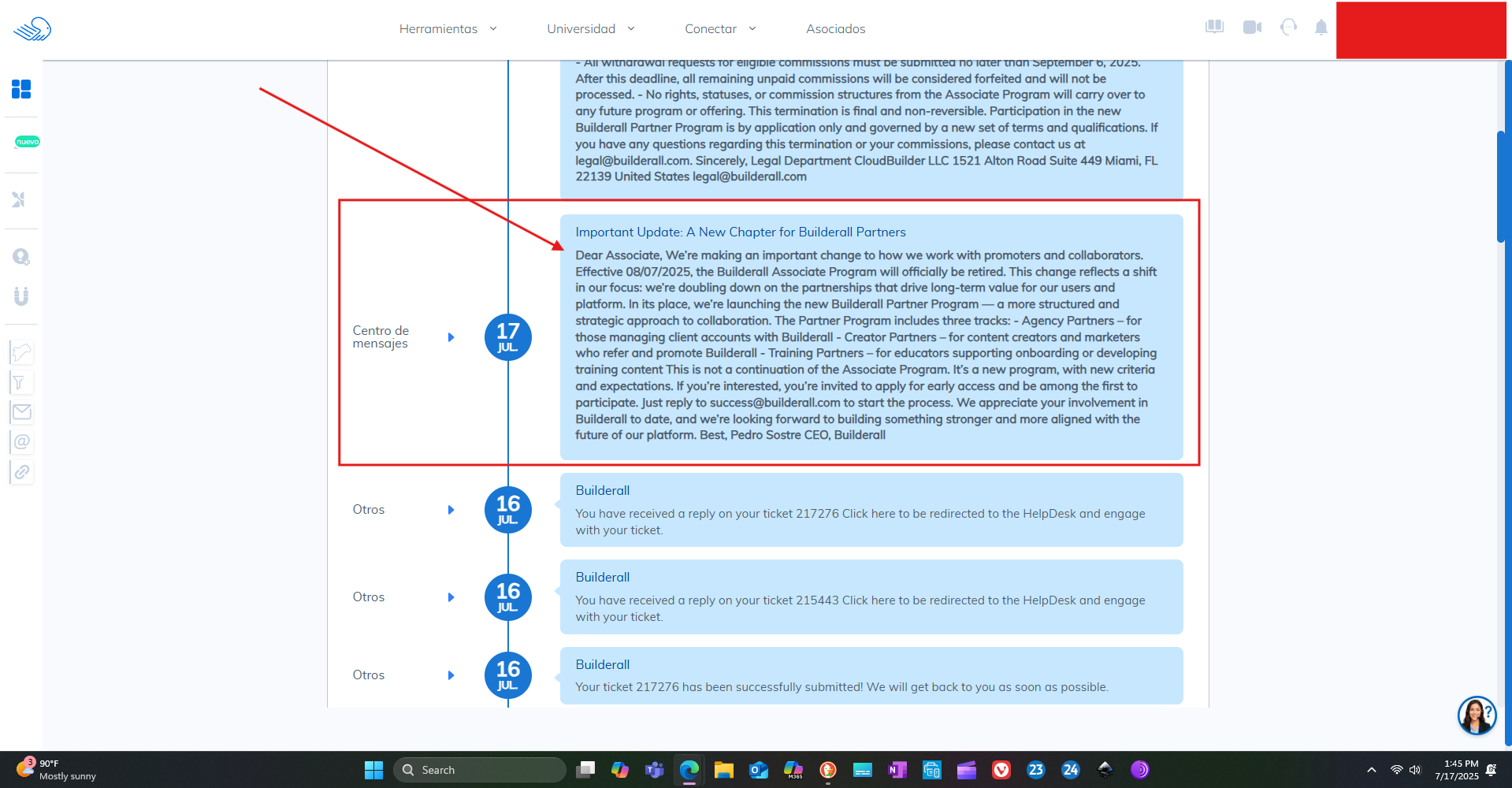 Hoy Julio 17 de 2025, Builderall anunció oficialmente que su Programa de Asociados finalizará el 7 de agosto de 2025. Después de esa fecha, no se generarán nuevas comisiones, ni por referidos, renovaciones ni clientes recurrentes. Aún más preocupante, las comisiones impagadas se perderán si no se retiran antes del 6 de septiembre de 2025, y debes cumplir con un mínimo de 100$ en la moneda que desees.